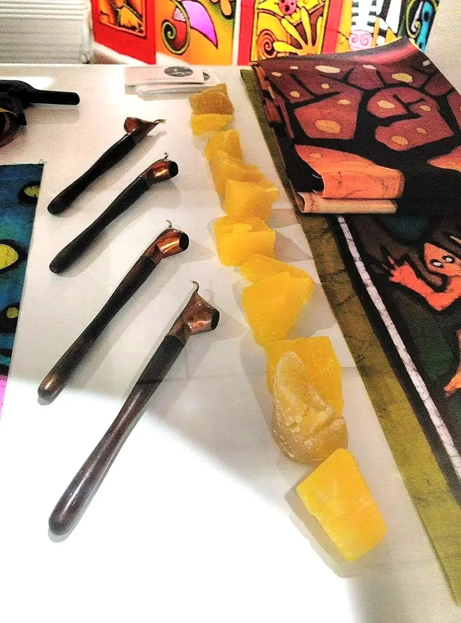 Este processo de tingimento e aplicação de cera pode ser repetido para criar muitos desenhos elaborados e coloridos.